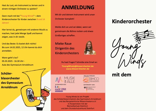 Das Burgsteinfurter Blasorchester e.V. bietet in Kooperation mit dem Schülerblasorchesters des Gymnasium Arnoldinum Steinfurt und den Steinfurter Grundschulen das Projekt „Young Winds“ als musikalisches Ausbildungsprojekt an. Das Projekt ist Teil des bundesweiten Initiative „Musik für Alle“ des BMCO (Bundesverband Musik für Chor und Orchester) und wird gefördert vom Bundesministerium für Bildung und Forschung.